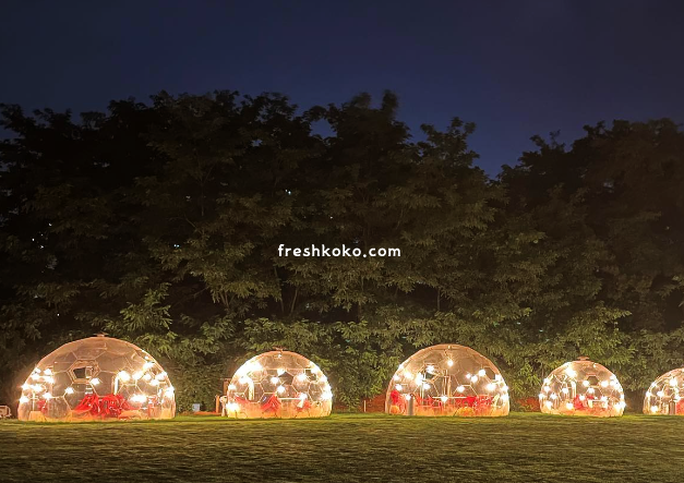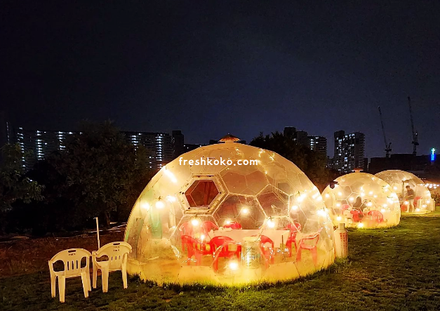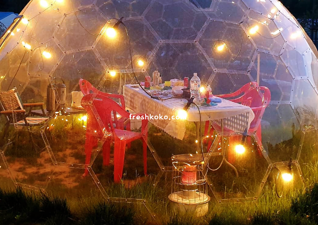 어두컴컴한 밤에 투명 이글루에 들어가 바베큐 파티를 만끽합시다.