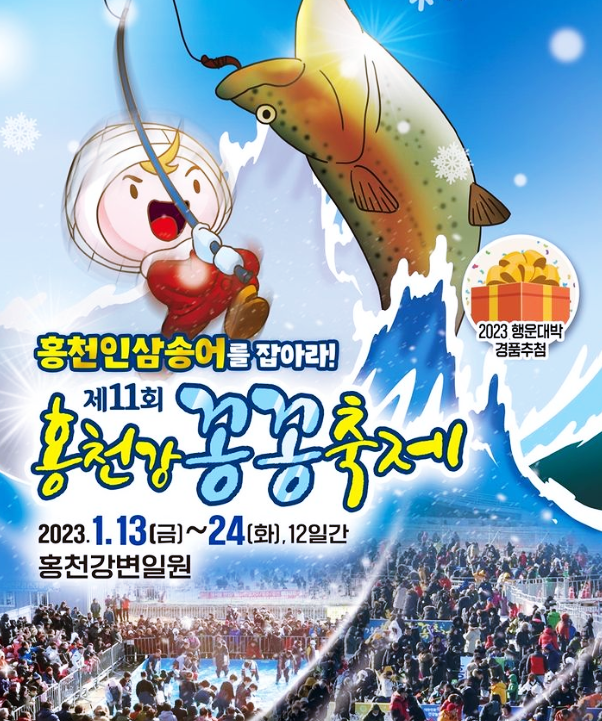 아이들에게 인기만점인 실내낚시에서부터 꽁꽁언 홍천강 풍경 그리고 시골풍경을 제대로 느낄 수 있는 초가집 풍경 겨울철 민속놀이터 그리고 맛있는 음식들이 즐비한 먹거리 장터까지 다양하게 즐길 수 있는 1월 축제 입니다.