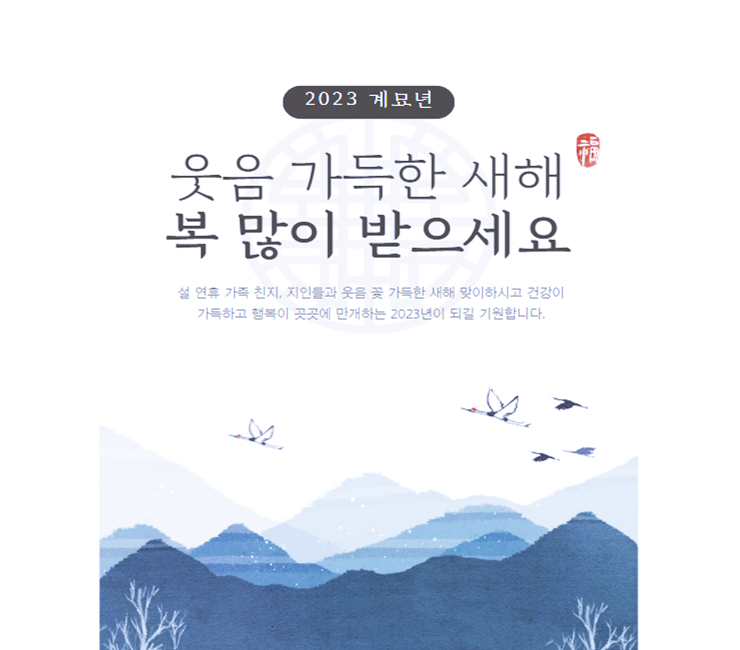 - 해가 바뀌어도 여전히 멋진 당신 이렇게 소식 전할 수 있다는 것만으로도 행복합니다. 2023년 더욱 좋은 인연 이어가길 기원하며 즐겁고 유쾌한 설날 보내시길 바랍니다.