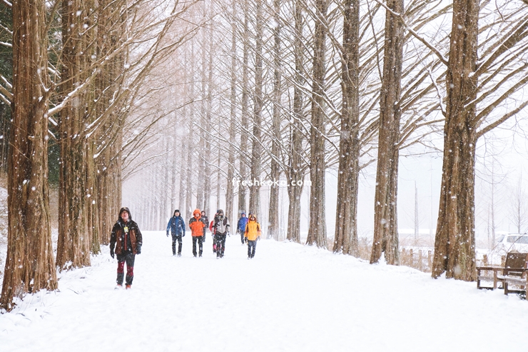 눈 내리는 날 관방제림과 함께 구경하면 좋은 메타세콰이어길입니다. 겨울의 풍경을 아름답게 감상할 수 있어서 특별했던 2월 축제 가볼만한곳 베스트10입니다. 하얀 눈길에서 삼삼오오 걸어오는 분들을 보면 더욱 멋진 겨울그림을 관람할 수 있습니다.
