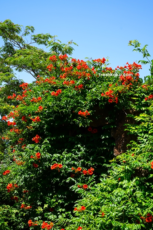 비체올린은 여름에 만개하는 능소화 뿐만 아니라 다양한 꽃을 구경할 수 있는 곳 입니다. 특히 빨주황빛 능소화는 넝쿨을 따라 이어져 꽃내음을 가득 피워내는데 그모습이 너무 아름다워 인생샷을 건질 수 있습니다.