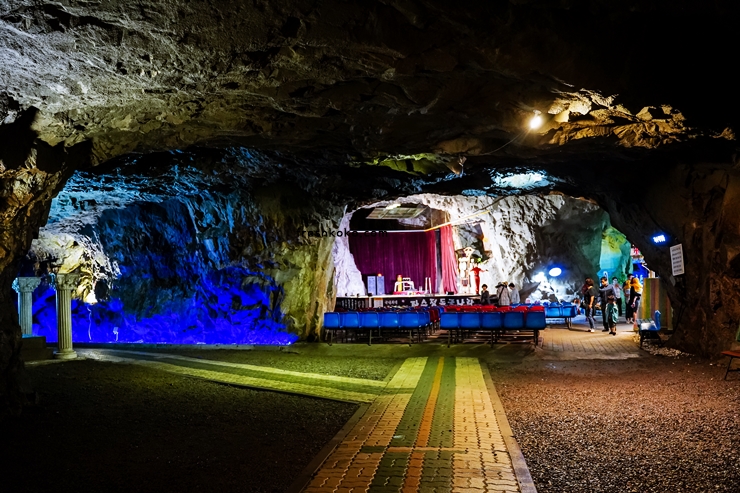 신비로운 동굴탐험을 경험할 수 있는 언양자수정동굴입니다. 실외에는 놀이공원이 있으며 실내는 이렇게 자수정동굴이 자리잡고 있습니다. 서커스공연 및 냉방, 찜질방 등 다채로운 체험을 할 수 있는 피서지입니다.