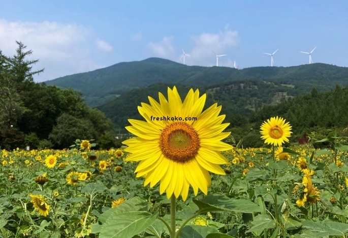여름을 상징하는 노오란 해바라기꽃을 하염없이 감상할 수 있는 8월 국내여행지 베스트 10 입니다. 자연스럽고 평화로운 구와우 마을에서 백만송이 해바라기꽃을 만끽할 수 있습니다.