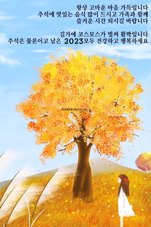 20. 항상 고마움 마음 가득입니다. 추석에 맛있는 음식 많이 드시고 가족과 함께 즐거운 시간 되시길 바랍니다. 길가에 코스모스가 활짝 핀 추석은 물론이고 남은 한 해 건강하고 행복하시길 기원합니다.