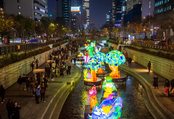 축제 기간 동안 청계천은 화려한 조명과 아름다운 랜턴으로 가득 차 마법 같은 분위기를 연출합니다. 방문객들은 물 위에 떠 있는 랜턴과 주변 지역을 장식하는 조명들 사이를 걸으며 독특한 경험을 할 수 있습니다.