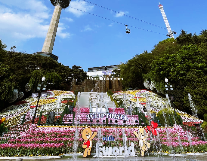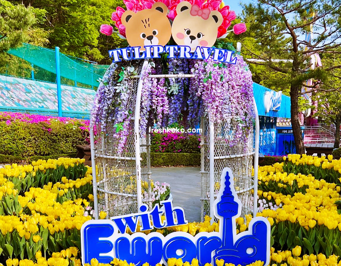 포포의 튤립 러브힐'은 이월드에서 가장 화려한 튤립 스팟 중 하나로, 파란 하늘, 타워, 튤립과 함께 인생샷을 남길 수 있는 최적의 장소입니다. 또한, 숲속 동화 속 주인공처럼 느껴질 수 있는 '비비프렌즈 캠핑 튤립가든'도 방문객들에게 추천되는 포토존입니다.