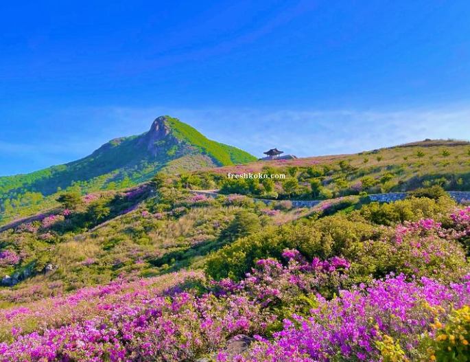 황매산은 해발 1,108미터의 높이를 자랑하며, 산 전체가 진분홍색 철쭉 꽃으로 뒤덮이는 모습은 마치 분홍색 카펫을 깔아놓은 듯한 인상을 줍니다. 철쭉 꽃은 일반적으로 진한 분홍색을 띠며, 꽃잎은 다소 둥근 형태를 가지고 있는 5월 국내 여행지 추천 베스트10 명소 입니다.