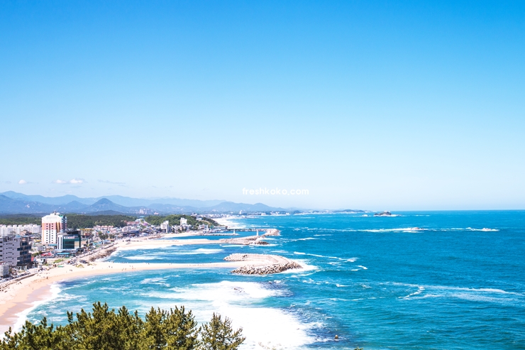 전망대에서 내려다보이는 해변은 깨끗하고 고운 모래로 유명합니다. 속초 해변의 부드러운 곡선을 따라 펼쳐진 해안선은 자연의 아름다움을 한층 더합니다.