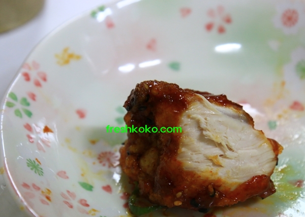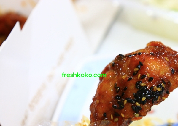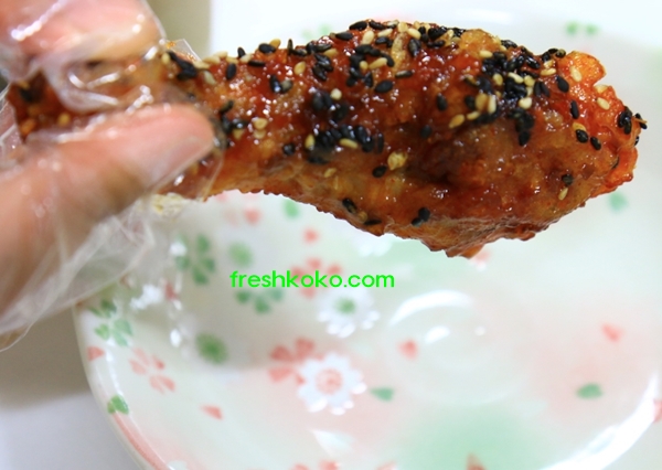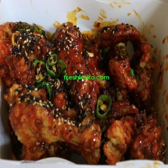 맵스터 치킨 먼저 닭다리 하나 뜯어 보겠다. 우선 매운양념이 구석구석 참 잘발라져있다. 빈틈이 없다. 사장님 솜씨가 예사롭지 않다. 검은깨가 솔솔 뿌려져있다. 우선 육안으로 보기에 비주얼은 아주 좋다.