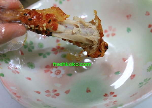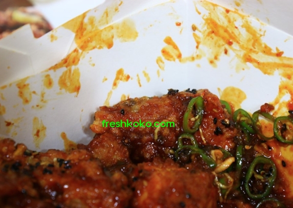 맵스터 치킨 먼저 닭다리 하나 뜯어 보겠다. 우선 매운양념이 구석구석 참 잘발라져있다. 빈틈이 없다. 사장님 솜씨가 예사롭지 않다. 검은깨가 솔솔 뿌려져있다. 우선 육안으로 보기에 비주얼은 아주 좋다.