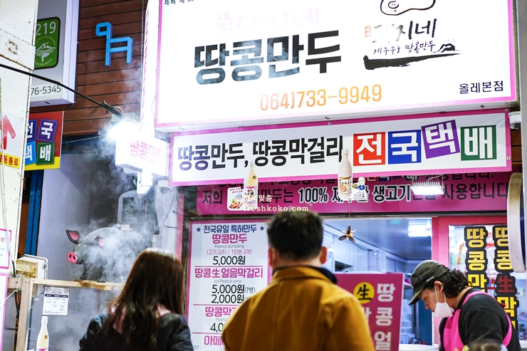올레시장을 들어서자 마자 곳곳에 먹거리가 많이보인다. 처음 맛보고 완전반한 한치빵, 땅콩만두 그리고 여러가지 재료를 섞어 만든 고로케 생각보다 맛이 좋았다. 그동안 전국의 전통시장을 많이 다녔어도 이렇게 특색있는 먹거리는 처음이다. 흑돼지로 만든 간식들이 많이 보였다.
