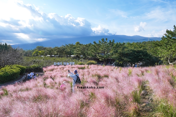 봄에는, 매화, 여름에는 수국, 가을에는 핑크뮬리축제가 열리는 곳 사계절 내내 꽃 구경하기 좋은 여행코스입니다. 면적이 넓은 곳에 핑크뮬리가 심어져 있어 조금 더 여유롭게 사진을 찍을 수 있겠습니다. 맑은 날에 방문하면 한라산을 배경을 사진을 찍을 수 있습니다.