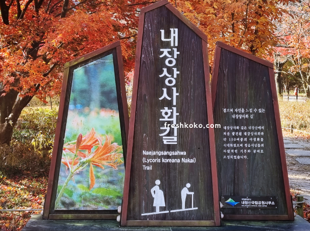 내장산 입구에서부터 아름다운 단풍이 펼쳐지는 단풍구경하기 좋은곳 입니다. 빨갛게 물들어가고 있는 단풍잎들과 낙엽들이 쌓여가고 있는 내장산둘레길 꼭 걸어보시길 바랍니다. 제대로된 가을정취를 만끽할 수 있습니다.